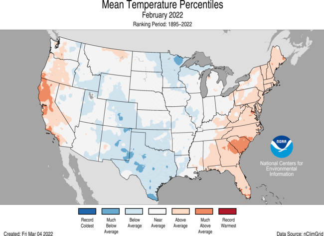 The average February temperature fell 0.1-degree Fahrenheit below the average for the 20th century.