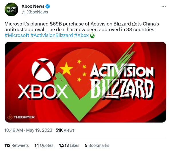 "The tech giant's $69 billion purchase of Activision Blizzard gets China's antitrust approval," Microsoft wrote on its Xbox News Twitter account. "The deal has now been approved in 38 countries."