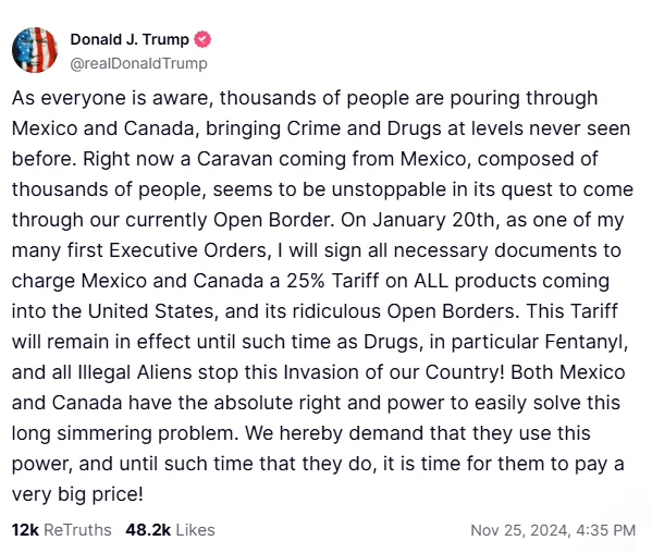 "As everyone is aware, thousands of people are pouring through Mexico and Canada, bringing Crime and Drugs at levels never seen before,” President-elect Donald Trump said," said Donald J. Trump, U.S. President-elect. "Right now a Caravan coming from Mexico, composed of thousands of people, seems to be unstoppable in its quest to come through our currently Open Border. On January 20th, as one of my many first Executive Orders, I will sign all necessary documents to charge Mexico and Canada a 25% Tariff on ALL products coming into the United States, and its ridiculous Open Borders. This Tariff will remain in effect until such time as Drugs, in particular Fentanyl, and all Illegal Aliens stop this Invasion of our Country!"