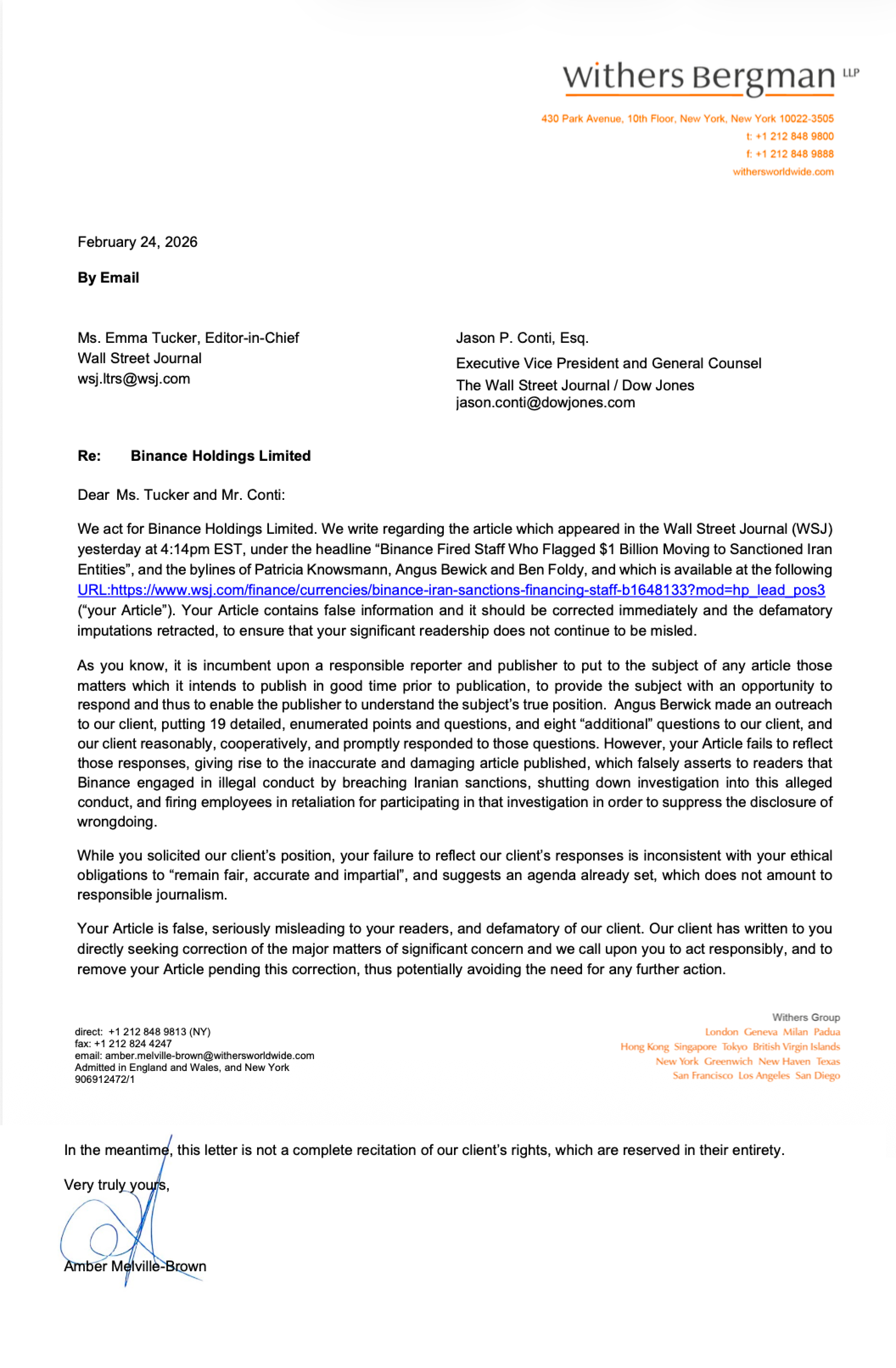 The issue arose after The Wall Street Journal published a story headlined "Binance Fired Staff Who Flagged $1 Billion Moving to Sanctioned Iran Entities." According to a letter sent by Binance Holdings Limited through law firm Withers Bergman LLP, the article is described as "false," "seriously misleading," and "defamatory." The letter, dated Feb. 24, 2026, urges an immediate correction or retraction and asks the publication to remove the piece pending correction according to Teng's statement.